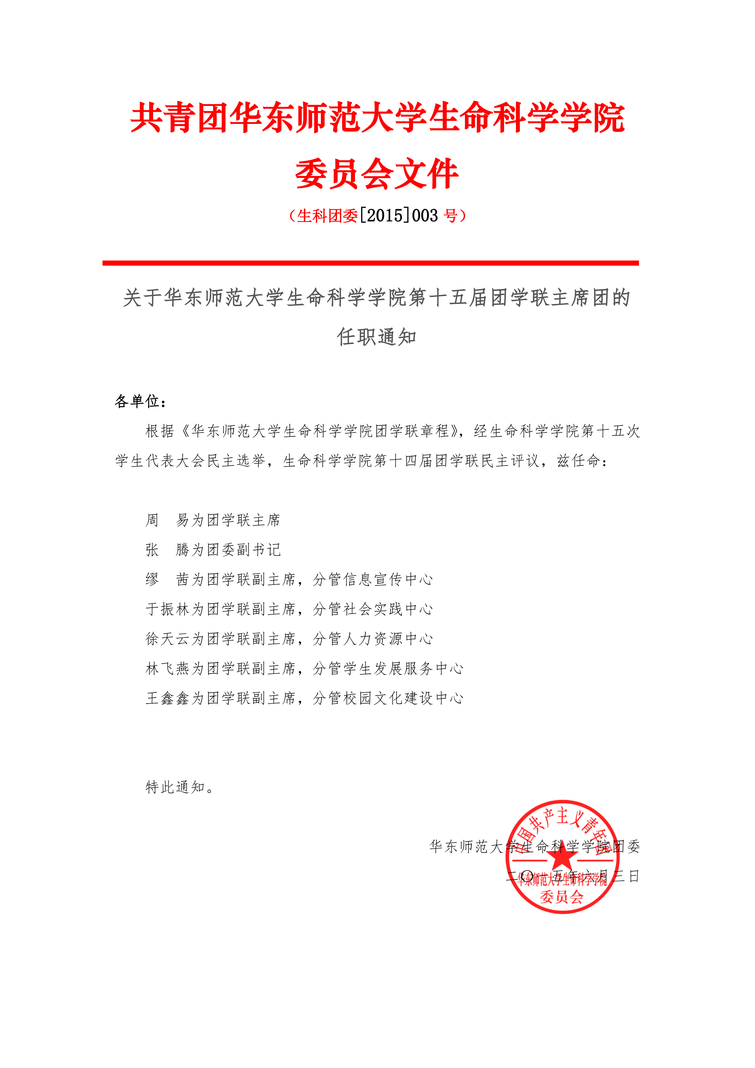 共青团华东师范大学生命科学学院委员会文件(生科团委[2015]003号)