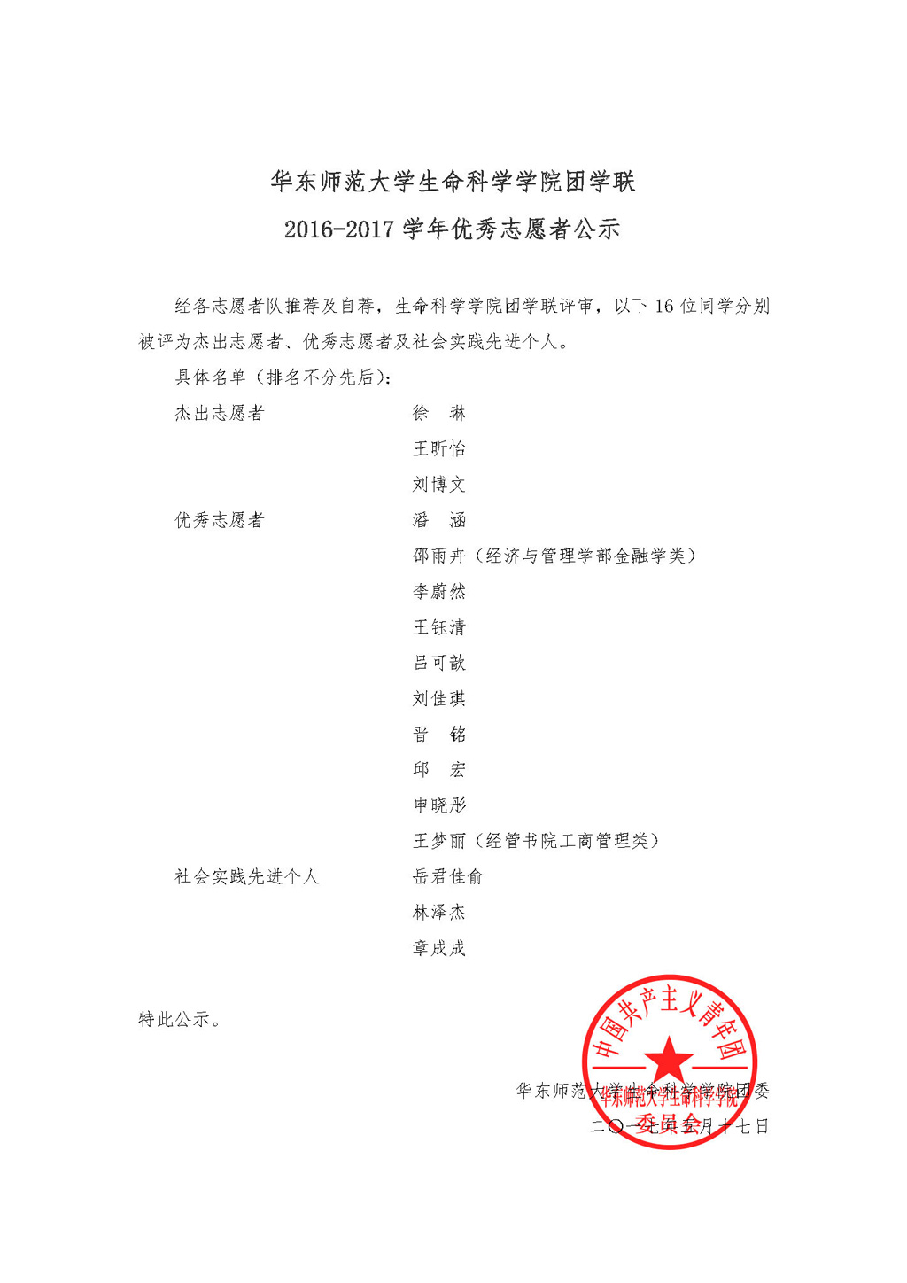 华东师范大学生命科学学院团学联2016-2017学年优秀志愿者公示