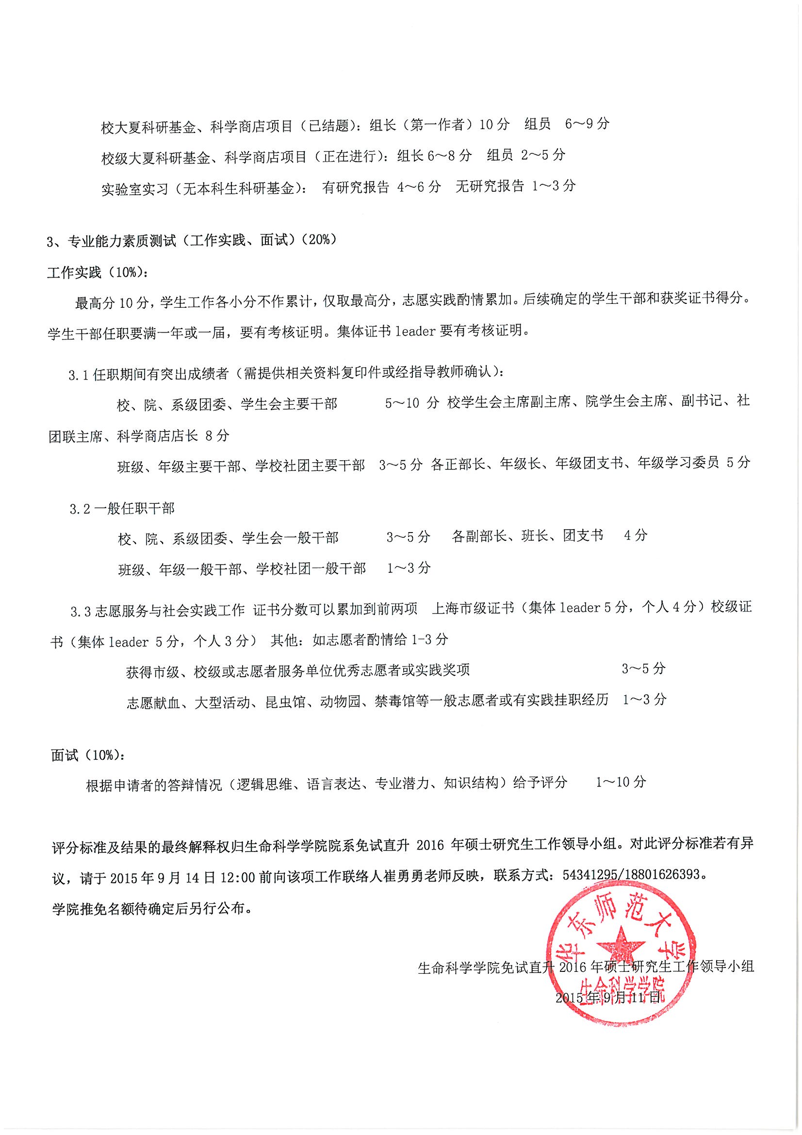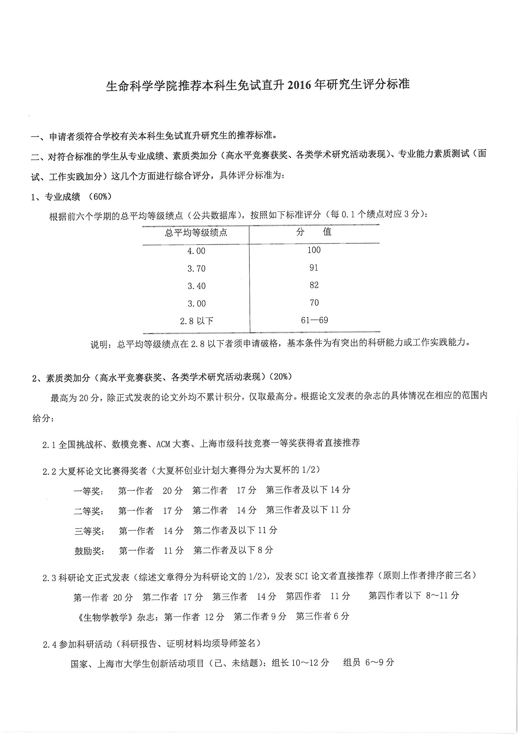 生命科学学院推荐本科生免试直升2016年研究生评分标准