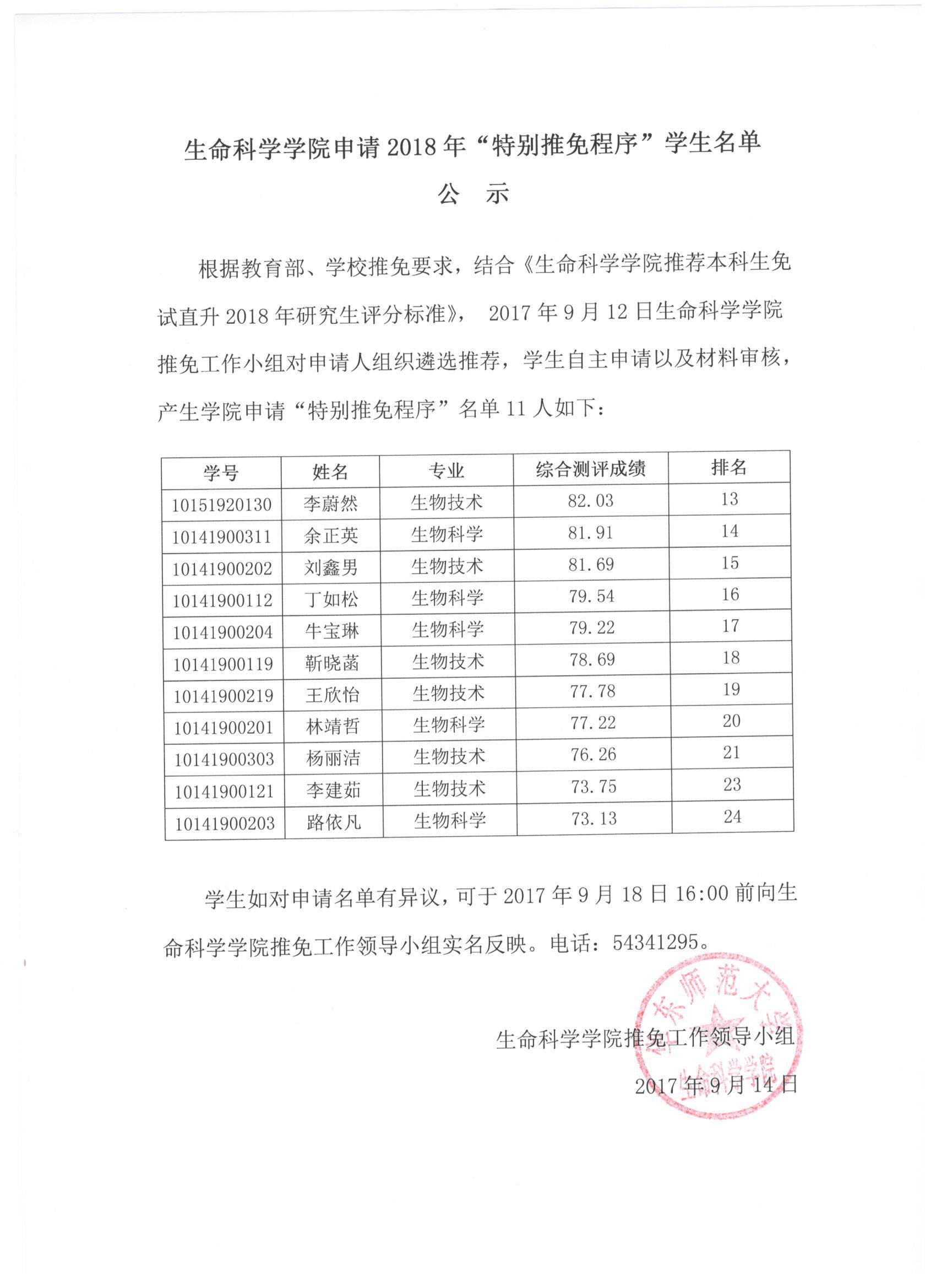 生命科学学院2018年申请“特别推免程序”学生名单公示
