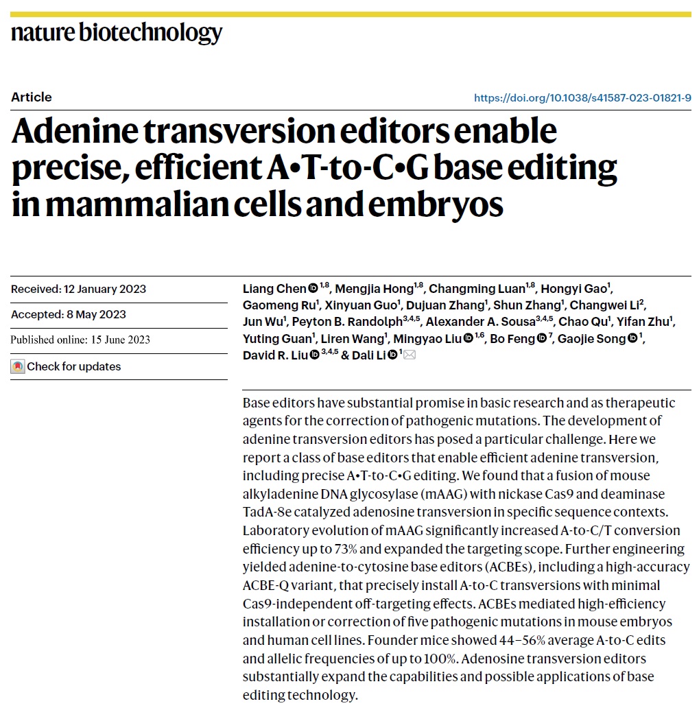 华东师范大学生命科学学院李大力教授团队继2022年10月在国际著名学术期刊 Nature Chemical Biology 报道新一代精准安全的腺嘌呤碱基编辑器ABE9以及11月在国际著名学术期刊 Nature Biotechnology 报道高精度新型胞嘧啶碱基编辑系统Td-BEs后,一年不到又迎来新的技术突破,2023年6月15日该团队再次在 Nature Biotechnology 上发表了题为“Adenine transversion editors enable precise, efficient A•T-to-C•G base editing in mammalian cells and embryos”的研究论文。