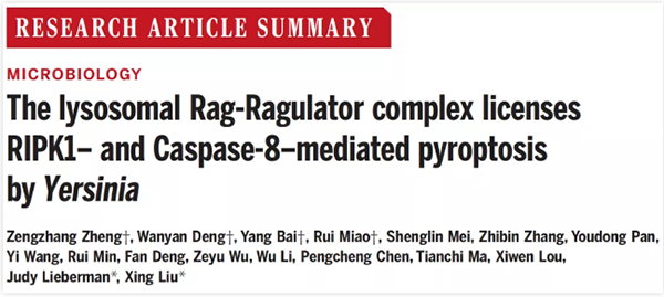 2021年6月25日,我院校友、中科院上海巴斯德研究所刘星研究员及其团队与美国哈佛大学医学院Judy Lieberman教授团队以研究长文(Research Article)形式在 Science 杂志发表题为The lysosomal Rag-Ragulator complex licenses RIPK1- and Caspase-8-mediated pyroptosis by Yersinia的论文,报道了通过CRISPR/Cas9全基因组敲除筛选鉴定出耶尔森菌感染并触发细胞焦亡的关键因子——Rag-Ragulator复合物,并揭示该复合物激活FADD-RIPK1-Caspase-8(complex Ⅱ)的分子机理。